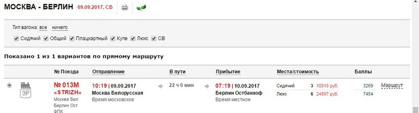 Минимальная стоимость билета до столицы составляет 1962 рубля (общий вагон), а вот до Берлина 10919 (сидячий вагон).