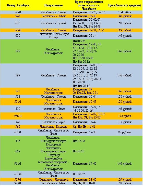 Довольна неплохая альтернатива, если у Вас нет возможности доехать до Южноуральска на машине. Автобусное сообщение между двумя этими городами развито хорошо, да и цена билета не сильно высокая. С автовокзала г. Челябинск (возле ДС «Юность») автобусы ходят регулярно, есть как прямые рейсы, так и проходящие. Однако время в пути в данном случае уже будет больше, в зависимости от маршрута от 2 до 4 часов. Расписание движения автобусов (зеленым цветом выделены прямые рейсы) представлено ниже. Более подробную информацию о расписание движения автобусов можно взять на официальном сайте автовокзала http://www.chelbus.ru/.
