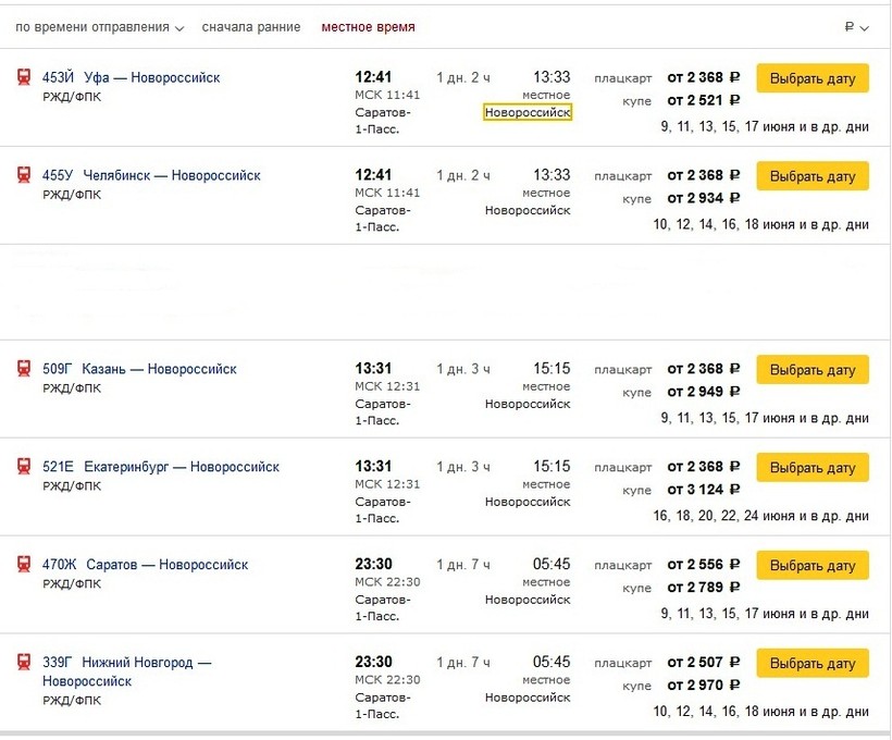 Стоимость билетов на поезд до Новороссийска начинается от 2368 рублей, если ехать в плацкарте. Если предпочесть купе, то за проезд придется отдать не меньше 2520 рублей.