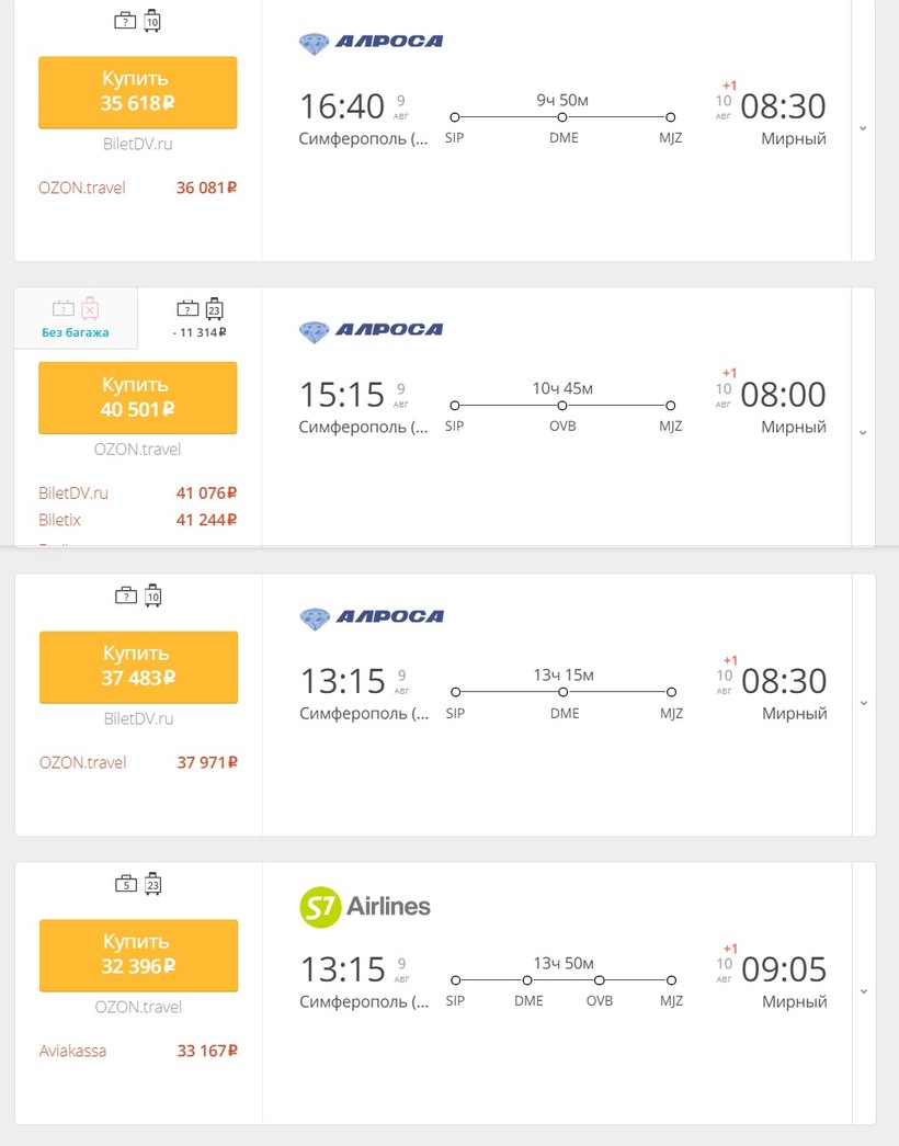 Я выбрал вот такой вариант. Вылет из Симферополя в 16:40 рейсом компании «Уральские авиалинии», а в 19:05 посадка в Домодедово. Далее придется немного подождать, и из этого же аэропорта вылет компанией «Алроса» в 21:15. Посадка в Мирном в 08:30. Общее время в пути составит 9 часов 50 минут.