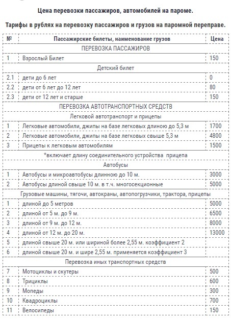 Паромы через пролив отплывают каждый час круглосуточно. Приблизительная стоимость в рублях на 2017 год приведена ниже: