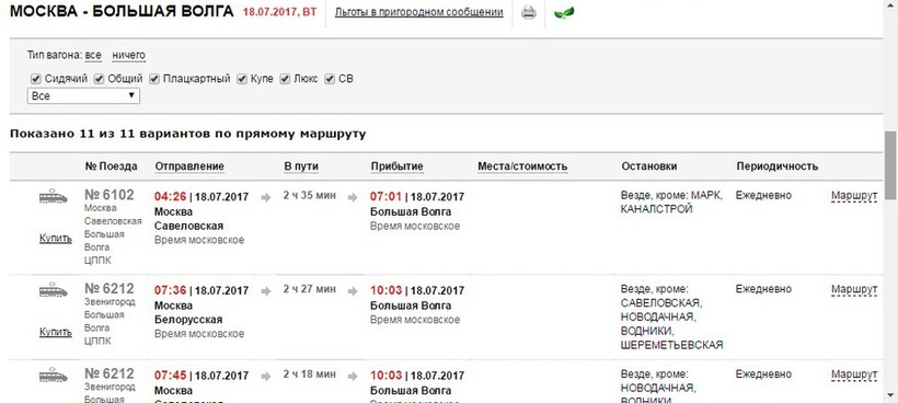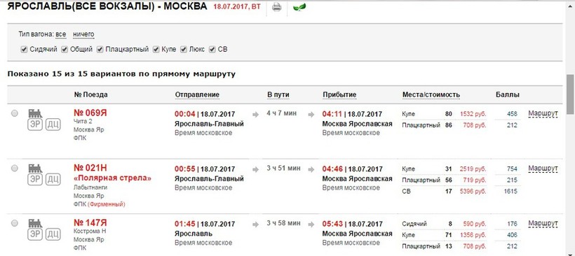 Делаем все аналогично предыдущему варианту. Рейсы до Москвы есть каждый день, но никогда не полагайтесь на график, так как очень часто составы сбиваются из расписания, так что потратьте пару минут, чтобы зайти на сайт железных дорог и проверить все ли идет, как положено. Сесть можно с 00:04 до 19:34. Дорога до Ярославского вокзала занимает до 4 часов.