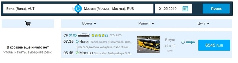 Билет на автобус Вена — Москва стоит 5 950 рублей (82 €).