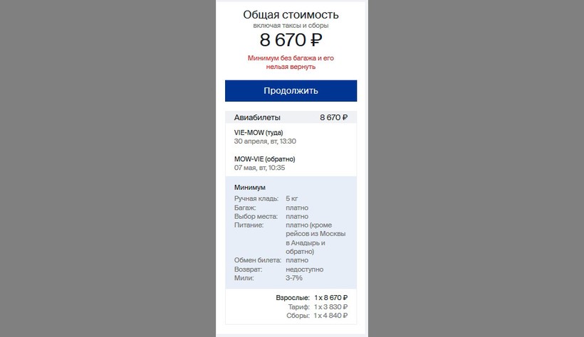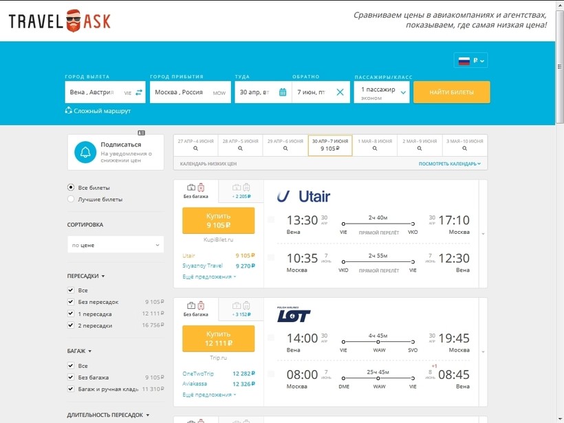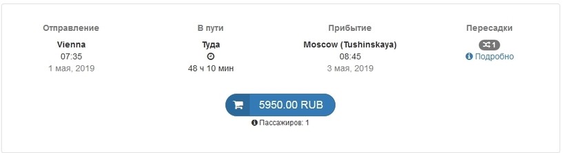 Самые дешевые рейсы Вена — Москва — Вена у авиакомпании Utair, белеты на такой рейс стоят 8 670 (120 €).