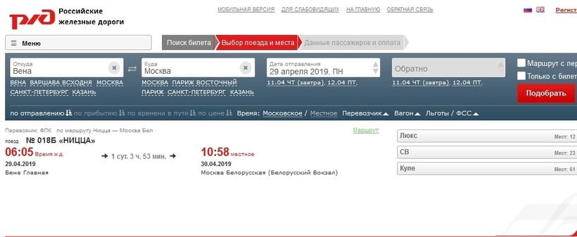 По понедельникам в 6 утра на Центральном вокзале Вены (Вин Хауптбанхоф) останавливается прямой поезд № 018Б Ницца — Москва.