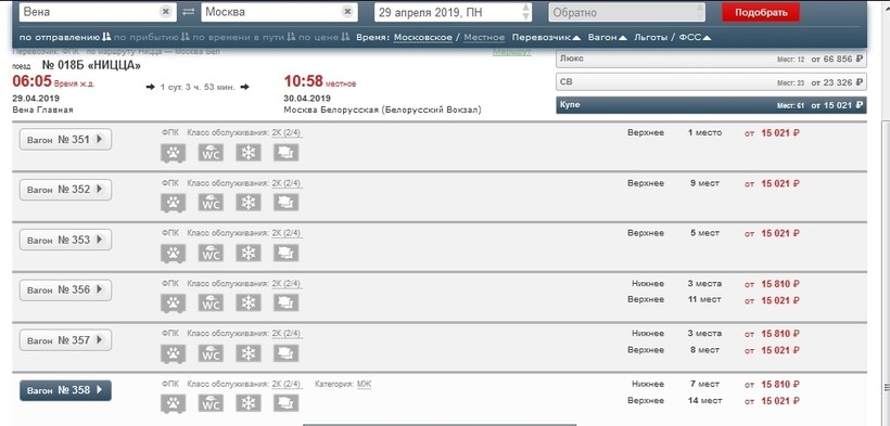 Билет на поезд от Вены до Москвы, причем самый дешевый (в купе, на верхней полке) стоит 15 000 рублей (206 €). И это только в одну сторону. Вот это цена!