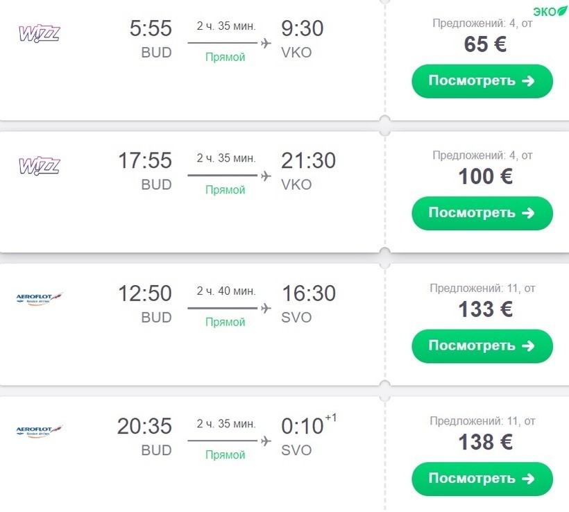Билет на самолет до Москвы обойдется от 65 евро (от 20880 форинтов или 4750 рублей).