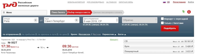 Хочу вас предупредить, что это прицепной вагон. В Риге этот вагон прицепляют к московскому поезду, а в Новосокольниках — к питерскому. Короче, вы ничего не почувствуете. :) Как зайдете в поезд в Риге (в 17:30), так и выйдете из него в Санкт-Петербурге (в 9:30). Доступен такой рейс ежедневно.