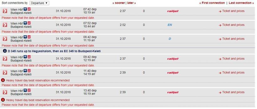 Можно воспользоваться и железнодорожным транспортом. Где находится главный железнодорожный вокзал Вены я уже рассказывал, поэтому сразу следует отправляться туда. Именно от него отправляются прямые поезда до Будапешта. Приведу скриншот с частью расписания их движения:
