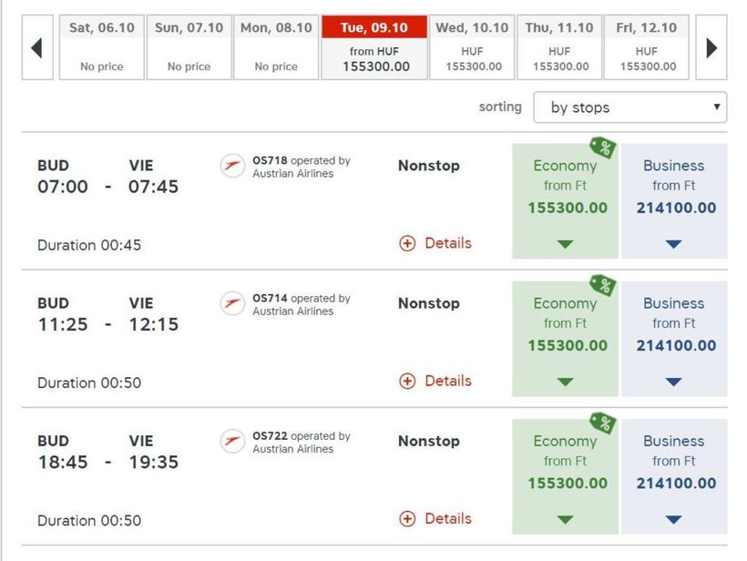У кого есть лишние деньги, тот может воспользоваться авиарейсом компании Austrian Airlines. Вот скриншот с расписанием с её сайта: