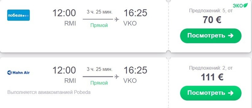 Проездной документ в Москву стоит от 70 евро (от 5080 рублей). По данному маршруту авиарейсы выполняет много авиакомпаний, но дешевле всего путешествовать из Римини в Москву на самолетах авиаперевозчков Pobeda и Hahn Air.