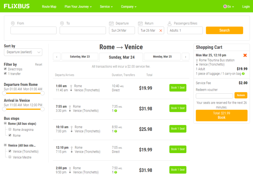 Из вечного города можно уехать на автобусе международной компании FlixBus. Автобусы комфортабельные, с кондиционером и вай-файем.