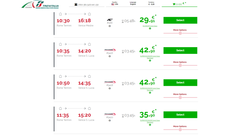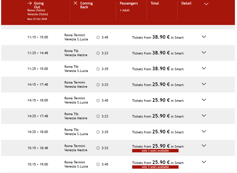 Как видите у Italotreno цена начинается от 25.90 евро, а у Trenitalia от 31.00 евро. Поезда комфортабельные, есть как сидячие вагоны, так и со спальными местами. Соответственно стоимость билета будет также зависеть от выбора вагона.