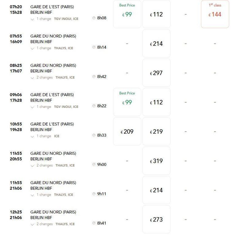Самый дешевый билет в вагон 2-го класса обойдется по меньшей мере в 99 евро.