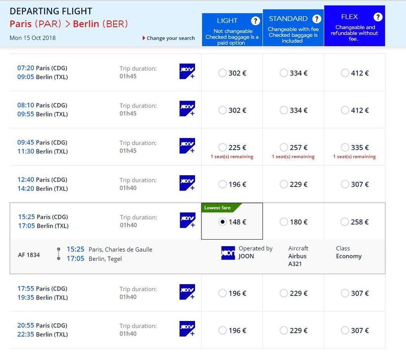 В Париже есть 2 аэропорта. Из аэропорта имени Шарля де Голля до Берлина можно долететь самолётом Air France. Вот скриншот с расписанием с официального сайта компании: