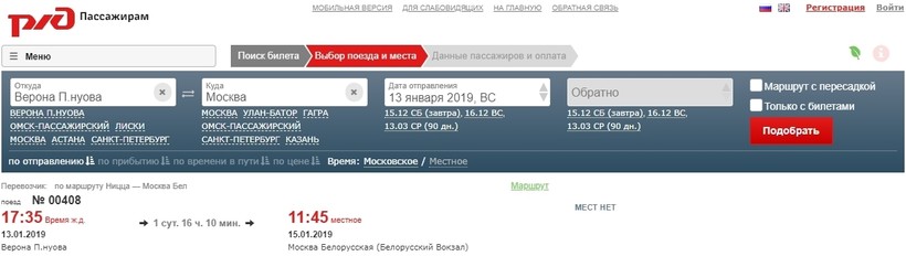 Раз в неделю в Москву из Ниццы ходит прямой поезд, что останавливается в Вероне.