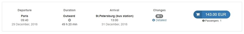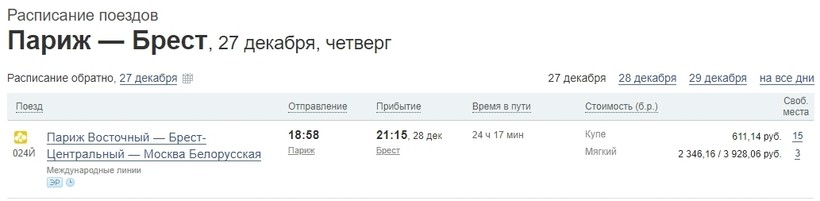 Билет обойдется в 143 евро. Купить можно либо на сайте этой компании, либо на автовокзале Парижа. Еще один вариант — путешествие через белорусский город Брест железнодорожным транспортом. Но такая поездка займет двое суток, поскольку на пересадку пойдет аж семнадцать часов. Вот рейс из Парижа в Брест.