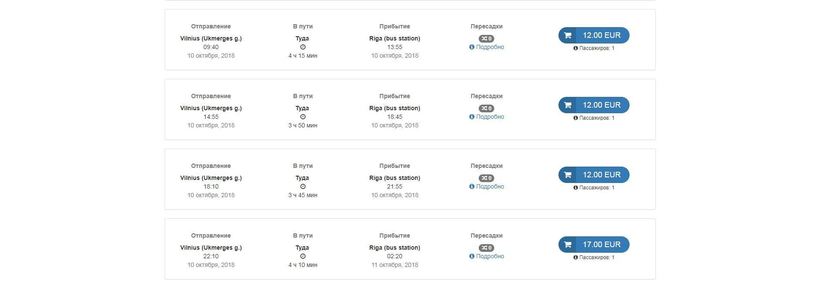 Ниже приведена информация о том, сколько часов вам потребуется, чтобы добраться от Вильнюса до Риги, а также приведена примерная стоимость проезда (средняя цена билета) на том или ином виде транспорта.