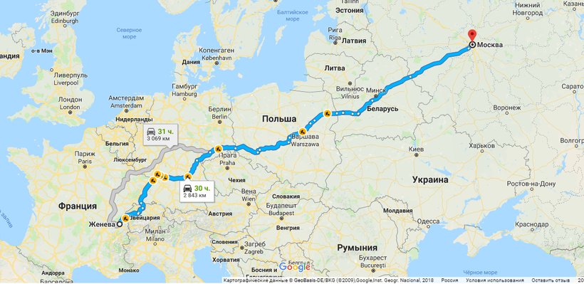 Чтобы доехать из Женевы в Москву на авто придется потратить больше суток, проехать около 3.000 км и пересечь несколько государственных границ: Франция (или нет, зависит от выбранного маршрута) —Германия — Польша — Беларусь — РФ.
