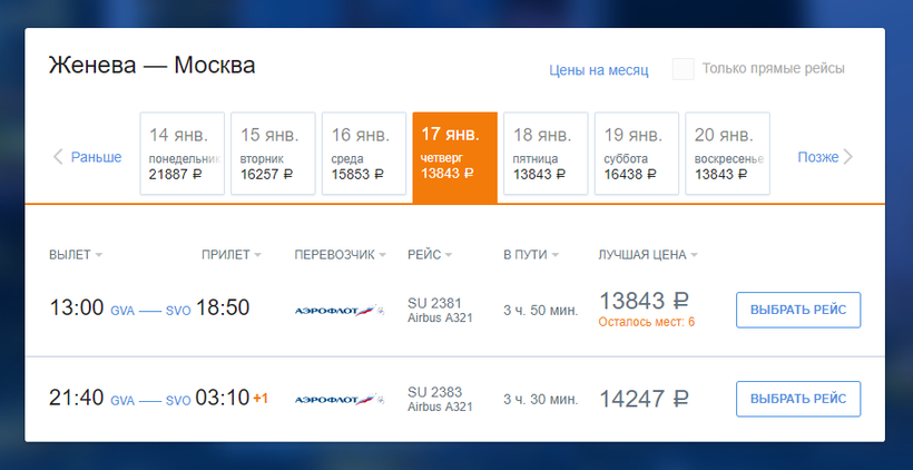 Рейсы Женева — Москва бывают несколько раз в день.