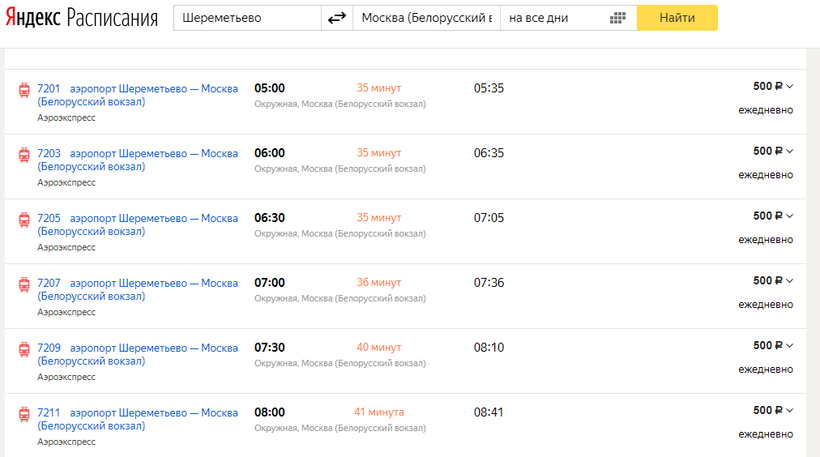 Поэтому предпочитаю аэроэкспресс: 500 рублей, 35 минут в пути и вот ты уже на Белорусской (метро). Поезда аэроэкспресса ходят с 5 утра до часа ночи, каждые полчаса.