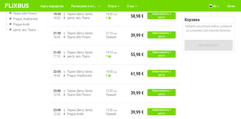 Мой любимый перевозчик совершает по два прямых рейса в день (кроме вторника и среды). Первый – в 21:30 (довезет вас через 21 час пути до вокзала Флоренц в Праге (Florenc, 186 00 Прага 8)), второй – в 23:00 (в пути 13,5-14 ч, можно выйти на Флоренц или доехать до вокзала Андел (150 00 Прага-Смихов)). Оба рейса отправляются от вокзала Bercy Seine в Париже.