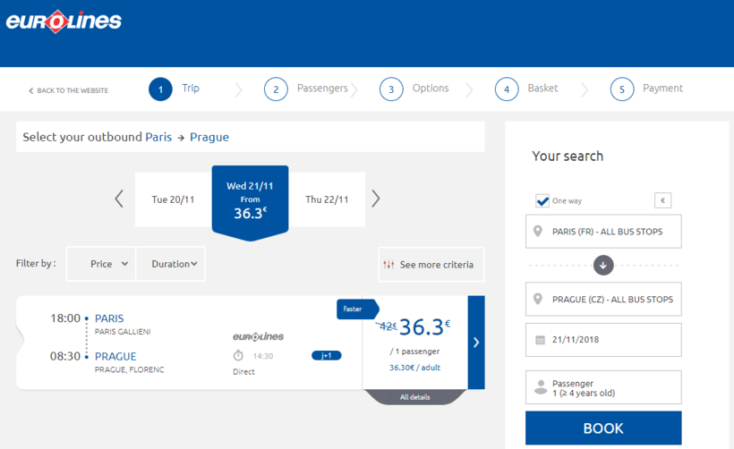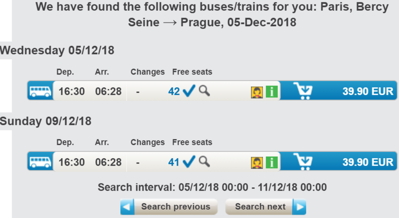 Этот перевозчик предлагает только два прямых рейса в неделю: по средам и воскресеньям в 16:30. Отправление с того же вокзала в Париже, что и Flixbus, прибытие – на Флоренц в Праге через 14 часов. В салоне предлагаются те же плюшки, что описаны выше, плюс бесплатная пресса и чай/кофе. А вот из минусов – Wi-Fi ловит только на территории Чехии.
