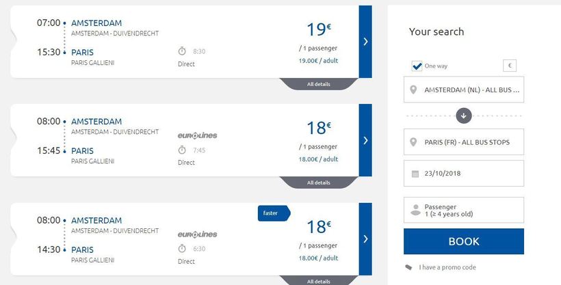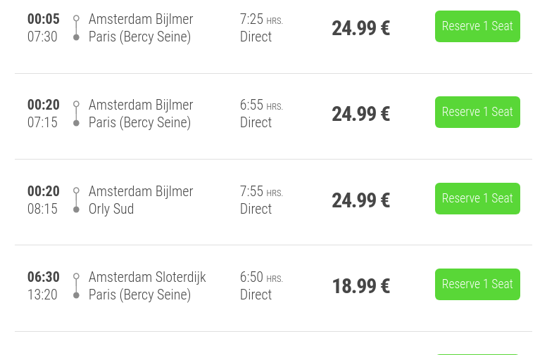 Дабы не захламлять текст картами с остальными остановками, дам ссылки на страницы, где можно посмотреть остальные станции — в Амстердаме и Париже соответственно. Условия на борту автобусов обеих компаний примерно одинаковые. Пассажиры могут расслабиться и пользоваться бесплатным Wi-Fi, заряжать свои телефоны/планшеты/ноутбуки от розетки или же просто поспать в креслах, благо они довольно-таки удобные. Также на борту есть такая немаловажная вещь, как туалет. В пути нужно будет провести 7–8 часов в зависимости от рейса. В целом же, я считаю автобус отличным вариантом прямого проезда. Есть у компаний и рейсы с пересадками, но я считаю их не слишком-то интересным вариантом.