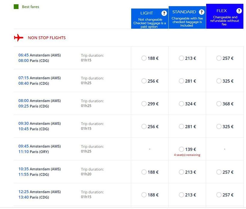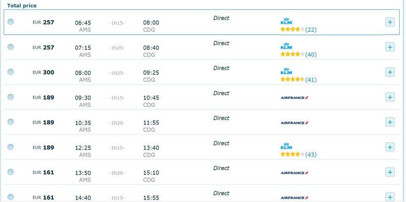 Как видно, обе компании сотрудничают, и цены на билеты у них совпадают, равно как и аэропорты вылета (Схипхол) и прилёта (Шарль де Голль). Какой авиарейс выбрать — личное дело каждого. Лететь придется примерно часа полтора.