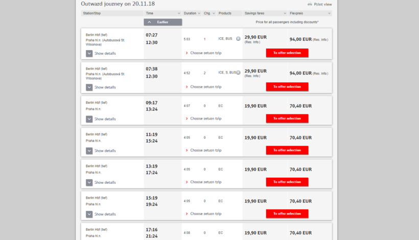 Перевозку осуществляет немецкая транспортная компания. И как видите цена варьируется от 19,90 евро до 94.00 евро, она зависит от выбора класса вагона. Приобретайте билеты заранее, так будет большая вероятность попасть на хорошие скидки. Советую не заморачиваться по поводу выбора вагона, так как все поезда очень комфортные, новые и чистые. А чудесный вид за окном скрасит вашу поездку.