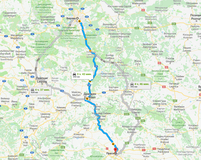 Берлин — Прага — маршрут на карте