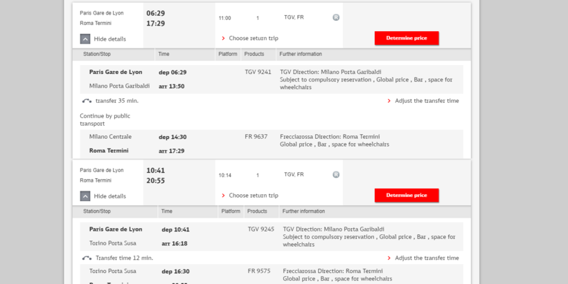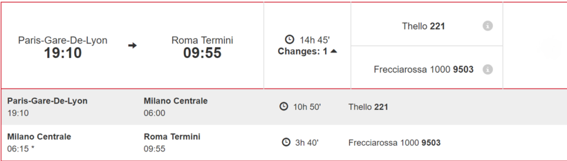 Thello в 19:10 отбывает из Парижа, в 6:00 приезжает на центральный вокзал Милана (Milano Centrale). Затем происходит пересадка на поезд Frecciarossa.В 6:15 он уезжает и уже в 9:55 прибывает в Рим.