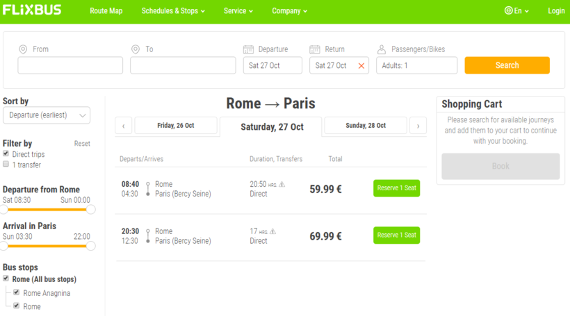 Других автобусов из Рима в Париж нет, поэтому выбирать особо не приходится: 59.99 евро за утренний рейс и 69.99 евро — за ночной. Я думаю, что ночной рейс будет приятнее, поэтому переплатить 10 евро все-таки стоит.
