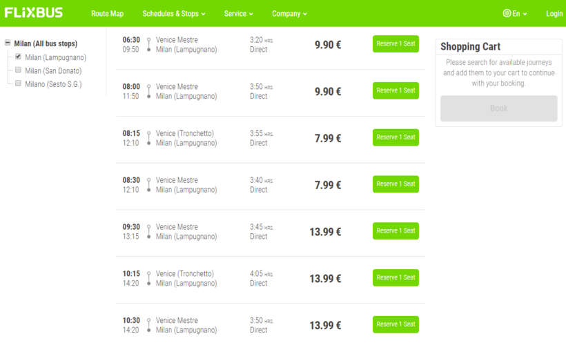 Прямой маршрут Венеция – Милан осуществляет только компания Flixbus. Автобусы всегда большие и комфортабельные, я была приятно удивлена, когда узнала, что стоимость багажа уже включена в стоимость билета.