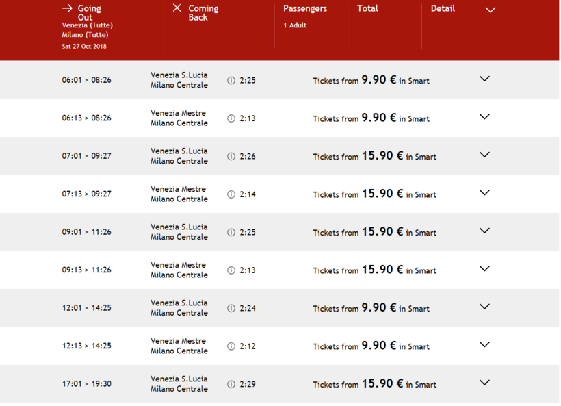 TrenItalia предлагает нам широкий диапазон времени, поезда прямого направления ходят с 06:20 и до 19:50. Покажу вам кусочек расписания на выходной день: