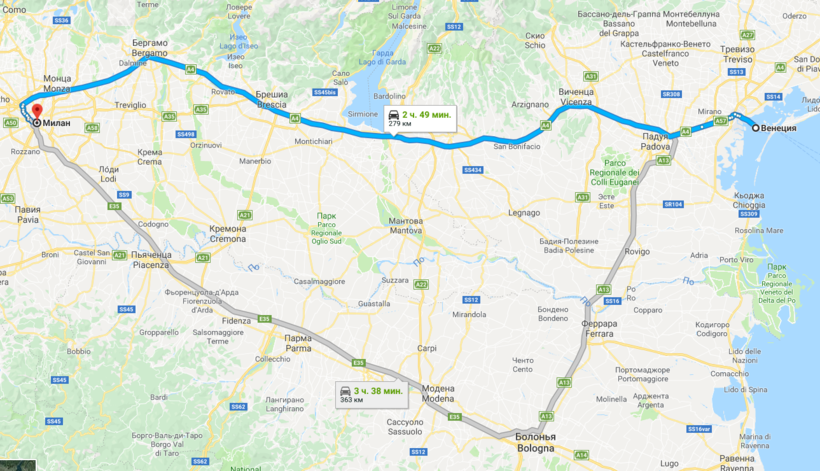 Между Венецией и Миланом 280 км, на машине преодолеете это расстояние примерно 2 часа 50 минут. Конечно, машина это один из самых комфортабельных и удобных вариантов. На выезде из Венеции и при въезде в Милан есть заправки-бары, там можно заправить машину, подключиться к вай-фаю и полноценно покушать. Дорогие хорошие, ям по пути не встретите, а верхнее ограничение скорость 130 км/ч, штрафы в Италии бешеные.