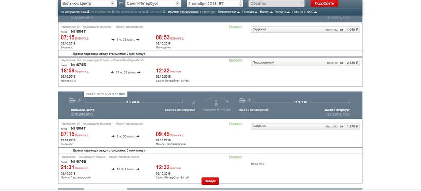 Если путешественник из России, то ему подойдет любой вариант, в моем же случае мне (как гражданину Литвы) приходится получать еще и беларусскую визу, чтобы сделать пересадку в Минске. Приведу фрагмент расписания с сайта РЖД: