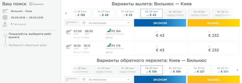 Как видно, в день летает 2 авиарейса. Лететь предстоит на Боинге 737, так что определенный уровень комфорта гарантирован. За минимальную сумму с собой можно взять только ручную кладь, если нужно взять больше багажа – придется доплатить. Вылетает самолет из аэропорта Вильнюса, прибывает в аэропорт Борисполь.