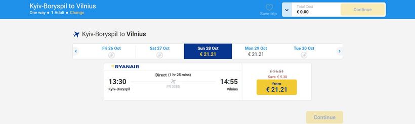 Минимальная цена билета на рейс Ryanair – 21,21 евро.