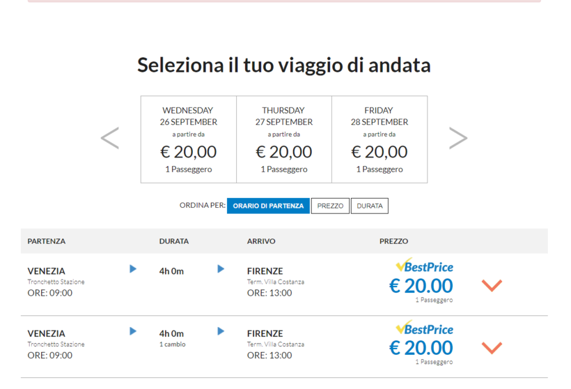 Ниже приведена информация о том, сколько часов вам потребуется, чтобы добраться от Венеции до Флоренции, а также приведена примерная стоимость проезда (средняя цена билета) на том или ином виде транспорта.