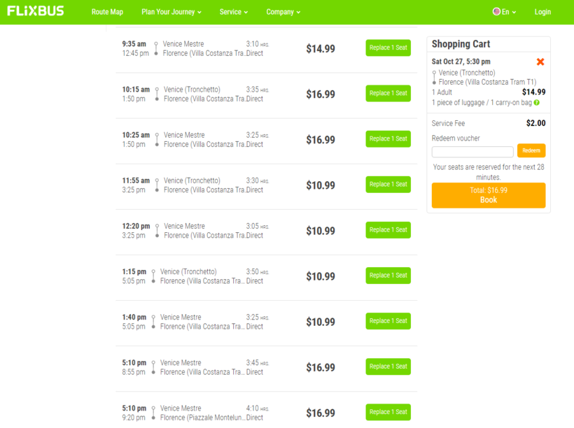 Как видите, самая привлекательная цена у компании FlixBus, есть билеты от 11 долларов (9.35 евро) плюс сервисный сбор 1.70 евро.