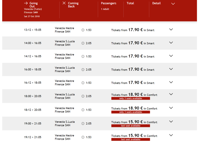 Как видите у Italotreno можно купить последний билет за 15.90 евро, так в прошлом году повезло и мне, я купила последнее место за неделю до отъезда всего за 12.90 евро.