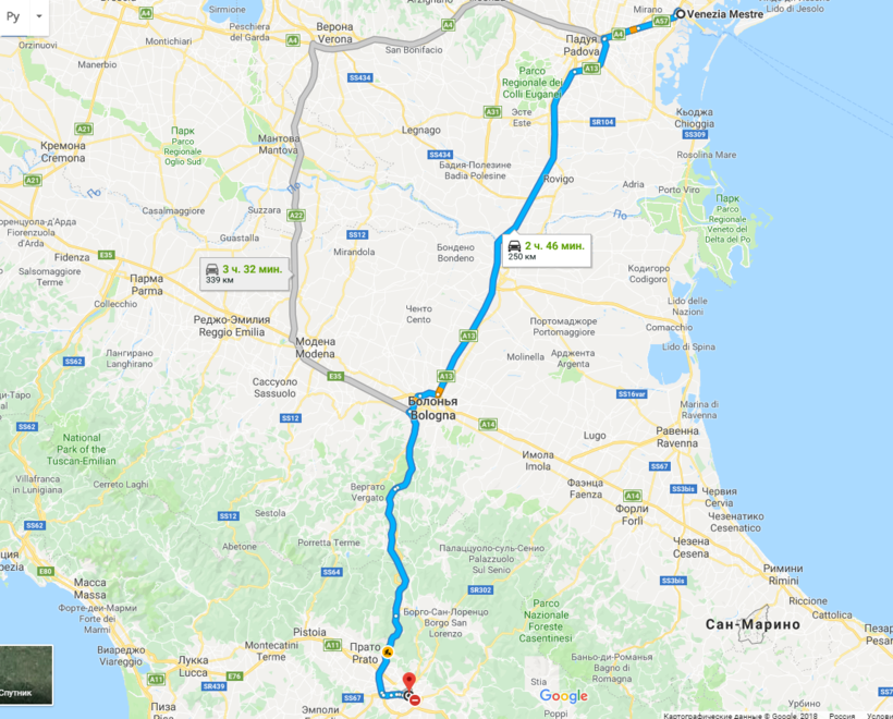 Расстояние между Венецией и Флоренцией составляет 126 километров или 78 миль по прямой и 257 километров или 160 миль по автодорогам.