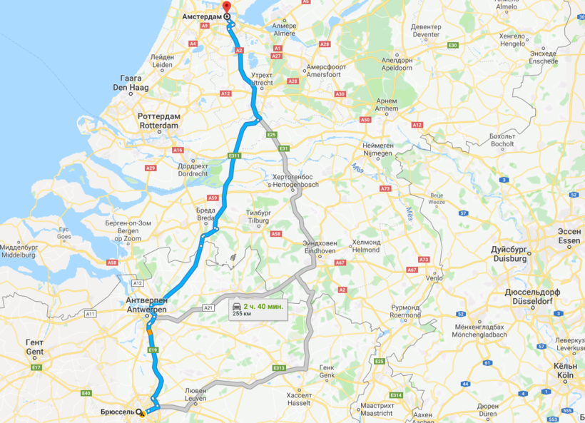 Расстояние между Брюсселем и Амстердамом около 200 км, на машине преодолеете примерно за два с половиной часа. Я думаю, это отличный вариант для путешествия с большой компанией! Дороги хорошие, а самое приятное, что платных автомагистралей и платных туннелей на пути не встретится. На выезде из Брюсселя есть несколько автозаправок, цена бензина варьируется от 1.50-1.65 евро за литр. Придорожные кафе вы можете встретить на въезде в город.