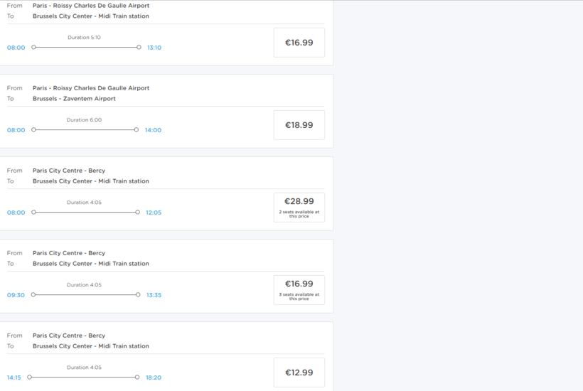 Ниже приведена информация о том, сколько часов вам потребуется, чтобы добраться от Парижа до Брюсселя, а также приведена примерная стоимость проезда (средняя цена билета) на том или ином виде транспорта.