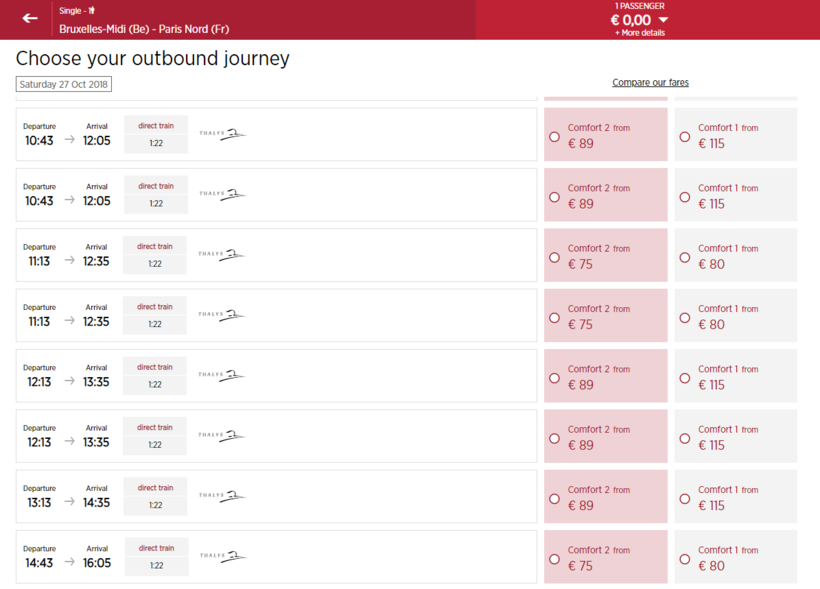 Как видите, цена во второй класс начинается от 75.00 евро, а в первый класс — от 80.00 евро. Но лично я не вижу смысла переплачивать, так как ехать меньше двух часов.