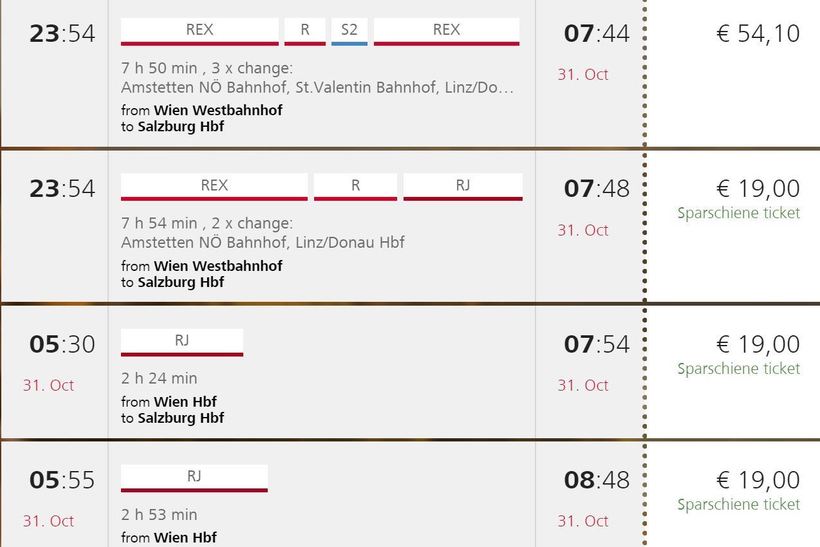 Прибывают поезда на главный вокзал Зальцбурга, который расположен тут: Есть и еще один частный железнодорожный перевозчик, поездами которого также можно добраться до Зальцбурга из Вены. Речь идет о WESTbahn. Точек отправления у них великое множество, это может быть как центральный вокзал, так и почти любая станция в Вене. Вот скриншот с их сайта: