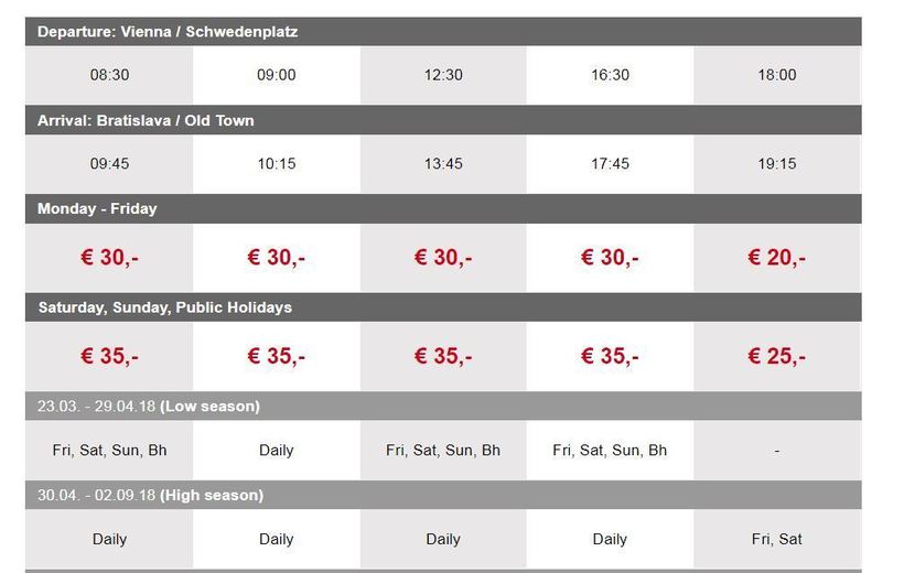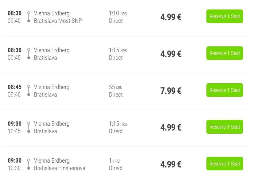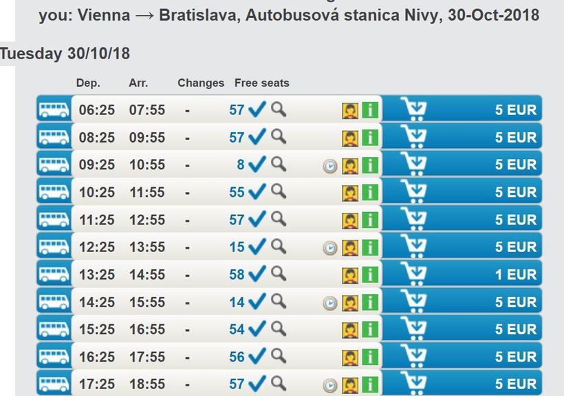Ниже приведена информация о том, сколько часов вам потребуется, чтобы добраться от Вены до Братиславы, а также приведена примерная стоимость проезда (средняя цена билета) на том или ином виде транспорта.