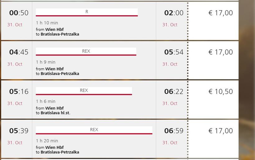 Можно воспользоваться и железнодорожным транспортом. Где располагается железнодорожный вокзал Вены я уже показал выше, повторяться не буду. Прибывают поезда либо на главный вокзал Братиславы, это вот тут: либо на станцию Petržalka: Расписание поездов можно посмотреть тут. Я же приведу для примера небольшой его кусок: