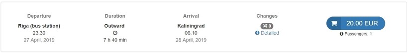 Ниже приведена информация о том, сколько часов вам потребуется, чтобы добраться от Риги до Калининграда, а также приведена примерная стоимость проезда (средняя цена билета) на том или ином виде транспорта.